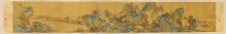 Not on viewThis handscroll invites us to visit a hidden world and may even lay out a perfect day of poetry, music, and companionship. From the right, meeting our waiting friend in a hut, we follow the trail around the first rocky peak and emerge in the foreground. The path takes us to a small compound, where two gentlemen await us and another guest who crosses the bridge below. His servant carries a wrapped musical instrument called a gǔqín 古琴, beloved by scholars. Further on, two servants carry our sumptuous lunch up a steep walkway to a temple in the hills. We wander until late afternoon, finding one more friend at his rustic residence. Finally, we board boats and float to a wine shop, marked by a pole and banner, where we end our day composing poems in a drinking game.