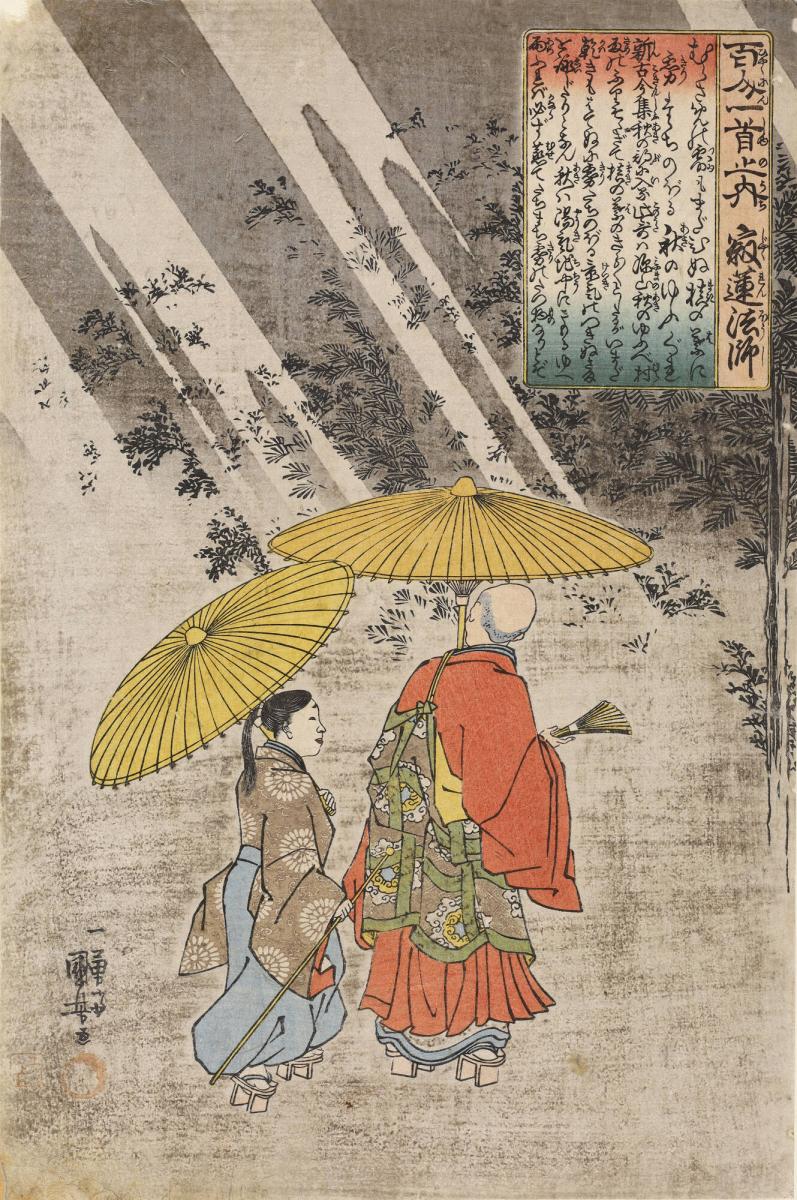 The Priest Jakuren Walking Past a Grove of Yew Trees in a Shower on an Autumn Evening, no. 87 from the series The One Hundred Poems
