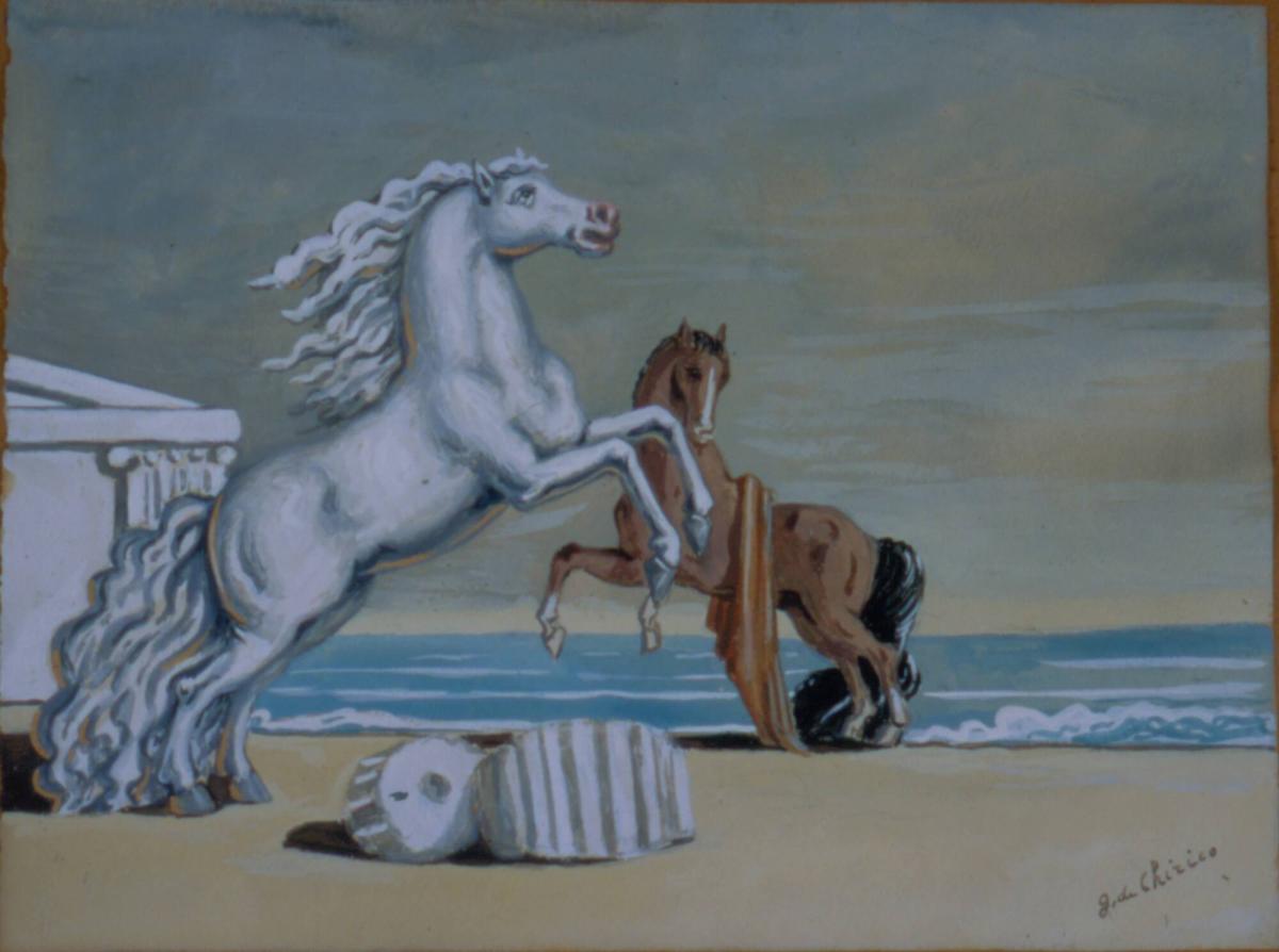 Not on viewDe Chirico, the originator of metaphysical painting, created this drawing during a period of transition in his career. Prior to the 1930s, his work paved the way for Surrealism. He explored themes such as nostalgia, enigma, and myth through disjointed spaces. After that decade, he turned to more conservative subjects, studying and copying the old masters and cultivating a neo-baroque style. This work, depicting two statue-like, rearing horses, is part of that transition. De Chirico's drawings and paintings of horses were very successful commercially, thus he drew and painted them prolifically throughout this period. Some dream-like qualities remain in this work: expansive space, disjointed perspective and scale, and the seeming plasticity of the stone ruins.
