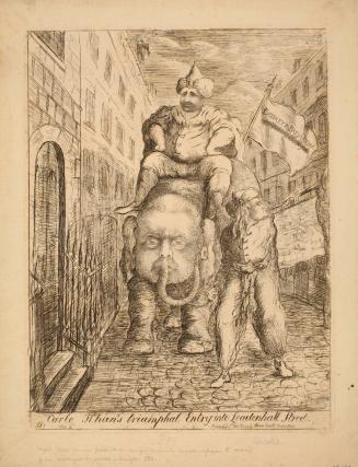 Not on viewWhen Charles Fox and Lord North's Whig coalition government proposed nationalization of the British East India Company in 1783, James Sayer responded with this portrait of Fox as "Carlo Khan," an Indian potentate riding an elephant with North's face. Regarded as one of the most influential political caricatures in history, Sayer's print established "Carlo Khan" as a symbol of the alleged rapacity of Fox's Whig party. When the nationalization plan was later discarded, Fox commented that the print had "done him more mischief than the debates in Parliament or the works of the press."