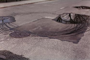 Not on viewOrozco's varied artistic production ranges from sculpture to video art to photography. The artist, who presently lives and works in New York, often interrelates found objects and inconspicuous situations, combining them to prove that meaning does not lie in the objects themselves, but in their relationships to one another. Orozco created the scene in Extension of Reflection by riding his bicycle between two puddles after a storm, and photographing the temporary pattern his tires inscribed on the urban landscape. His ability to animate the everyday is a central theme in his works: "What I'm after is the liquidity of things, how one thing leads you to the next…The works are about concentration, intention, and paths of thought."