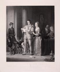 Not on viewGilbert Stuart Newton specialized in anecdotal scenes of literary subjects, widely distributed through engravings. His 1831 painting of an episode from Shakespeare's The Merchant of Venice, in which the lovers Bassanio and Portia receive a fateful letter reporting the impending death of Bassanio's friend Antonio, reflects the values of its Victorian context. Shakespeare's quick-witted and capable Portia, who ultimately saves Antonio through heroic feats and skillful rhetoric, here epitomizes feminine deference as she rests on the arm of her bolder husband. The niche sculpture of lovers, the embracing couple Nerissa and Gratiano in the background, and the coupled dogs-a traditional symbol of fidelity-reinforce the virtues of marriage and faithfulness.