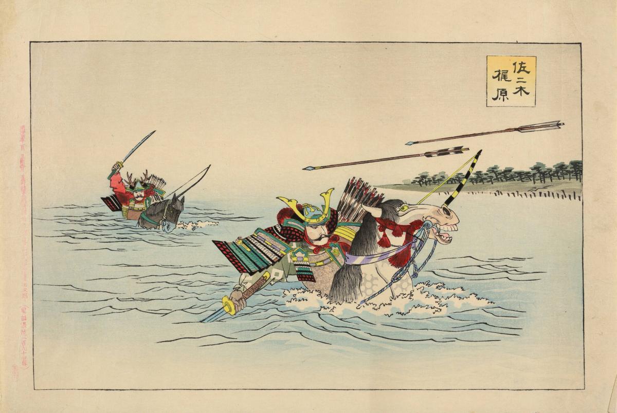 Sasaki Tadatsuna and Kajiwara Genta Crossing the Uji River, from an untitled series of historical subjects