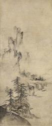 Not on viewThe tradition of ink monochrome landscape painting was brought from China to Japan by merchants and Buddhist monks in the thirteenth or fourteenth centuries. It was initially practiced by monk-painters active in the major Zen temples, but was also appreciated by the secular military elites who ruled Japan at that time. This Japanese scroll closely follows Chinese models. It depicts a mountainous landscape that is sharply defined in the foreground and becomes less distinct in the distance. Evidence of human civilization is visible but is dwarfed by the majestic natural forms. The composition is heavily weighted to one side, and large expanses of empty space give the image an evocative, lyrical quality. Indeed, the scroll belongs to a larger tradition of Chinese and Japanese paintings that were considered to be "poems without sound" and were intended to stimulate the viewer's imagination more than to portray a physical place.