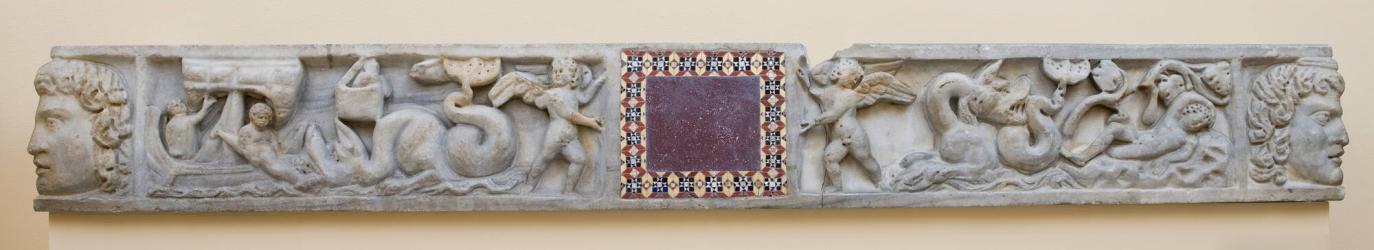 Provenance(Brummer Gallery, Paris and New York); purchased 1948 by Allen Memorial Art Museum, Oberlin, OHSarcophagi were often personalized with the original owner’s name and/or likeness. Artists likely obscured this feature with the central colorful stones in the medieval period.