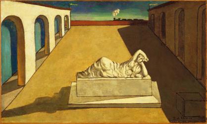 Born in Greece and educated in Germany, De Chirico moved with his mother to Paris in 1911, joining De Chirico's brother, also an artist, who had adopted the name Alberto Savinio. In 1912, De Chirico began to incorporate the figure of Ariadne into his paintings of Italian squares or piazzas. Notable among these paintings are Ariadne (1913), now in the Metropolitan Museum of Art, and Soothsayer's Recompense (1913), in the Philadelphia Museum of Art. Although executed on a much larger scale than the AMAM picture, these paintings share the same elements, including a sculpture of Ariadne, a train in the distance, its motion made prominent by curls of smoke, and deep shadows that articulate space. In 1913, De Chirico's friend, the critic Guillaume Apollinaire, described De Chirico's art as "metaphysical," a recognition of the enigmatic subject matter of much of the artist's work.