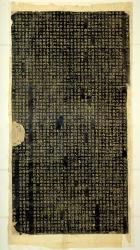 The texts could also be copied and circulated by making ink rubbings. To do so, wet paper is attached to the stele surface and pressed into the carved characters; then, after it dries, inked pads are pounded on the paper. The ink doesn’t touch the paper pressed into the depressions, leaving a sheet with white characters on a black background. Because very detailed copies resulted from this method, it was often used to reproduce renowned examples of calligraphy that were then used as models.