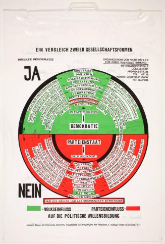 Not on viewOne of Joseph Beuys’s most ubiquitous multiples, the bag How the Dictatorship of the Parties Can Be Overcome embodies his aesthetic ideology, termed “social sculpture.” Beuys argued that everyone was an artist, in the sense that every human has an innate capacity for creativity that can be exercised through daily activities for the greater social good. In 1967, he founded a political party for students and subsequently created several more political action groups, including the Organization for Direct Democracy through Referendum, which lobbied against West Germany’s corrupt parliamentary democracy.