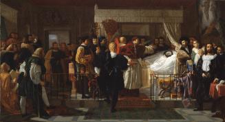 On viewThis homage to the great Italian Renaissance painter Raphael falls into the late eighteenth- to early nineteenth-century tradition of paintings of meetings between -or in this case, the deaths of-famous historical figures. Pierre-Nolasque Bergeret's painting depicts Pope Leo X and Cardinal Bembo, among many other important figures, at Raphael's deathbed in Rome in 1520. Architect and painter Baldassare Peruzzi points toward Raphael's last painting, the Transfiguration, which hangs over his bed; engraver Marcantonio Raimondi looks toward a cup of Raphael's blood with downcast eyes; and Michelangelo in a yellow cloak and fellow artist Sebastiano del Piombo in red enter at the door on the left. While the manner is realistic, the painting does not in fact depict an actual event; Michelangelo was not in Rome at the time, and Giorgio Vasari, who is shown at lower left penning Raphael's life for his book of the lives of artists, was a mere eight years old.