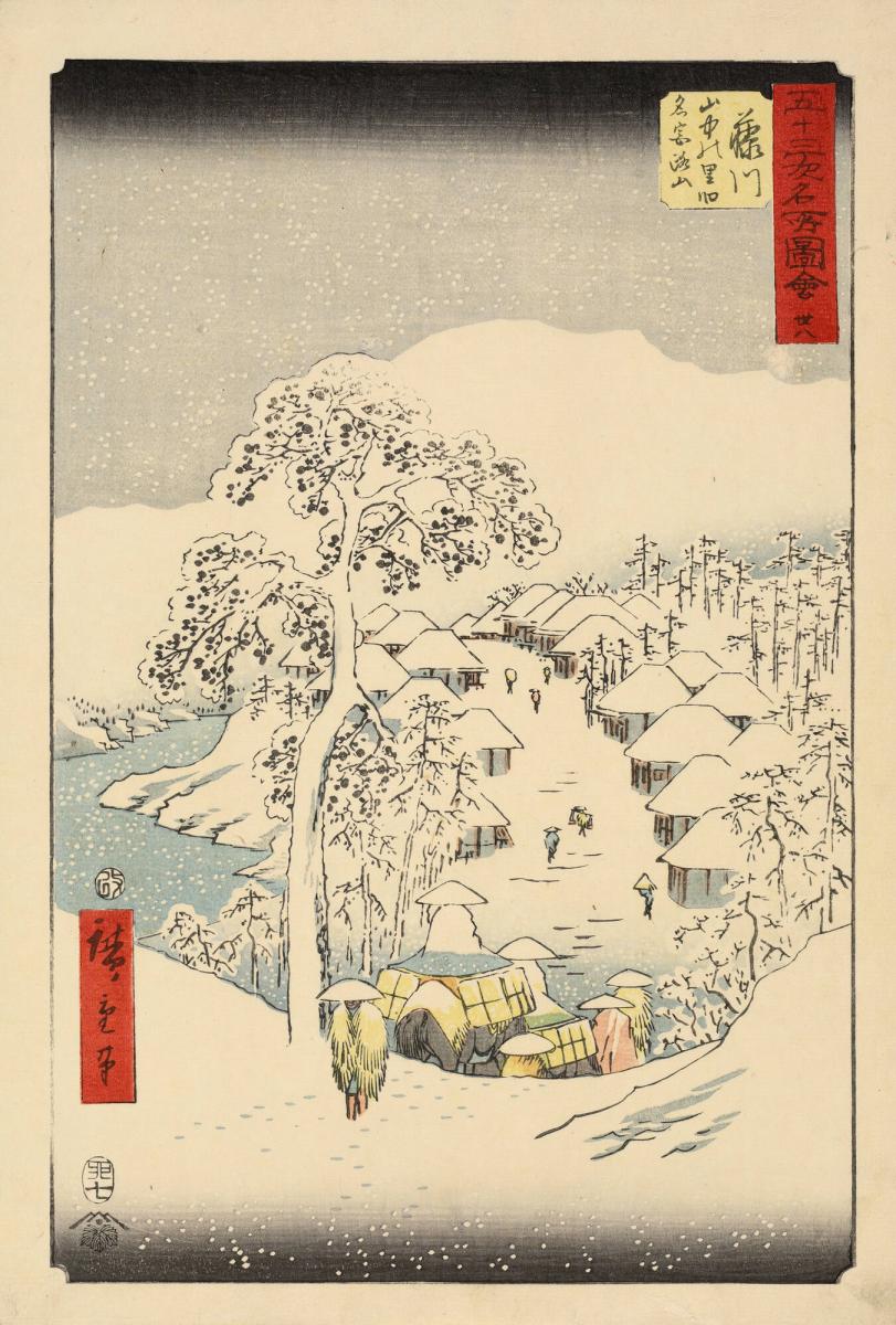 Snow at Yamanaka Village near Fujikawa, formerly called Mt. Miyaji, no. 38 from the series Pictures of Famous Places of the Fifty-three Stations, the Vertical Tōkaidō