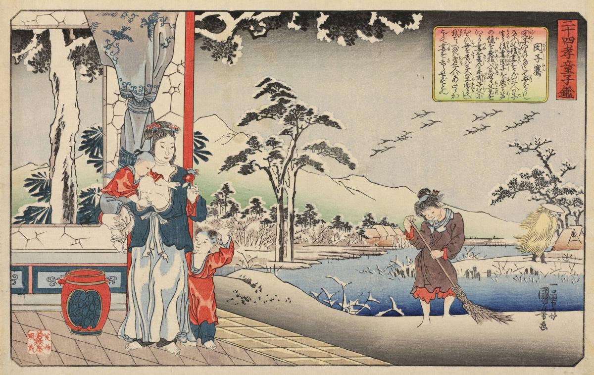 Min Sun (Binshiken) Sweeping Snow while His Stepmother Spoils Her Two Sons, from the series A Mirror for Children of the Twenty-four Paragons of Filial Piety