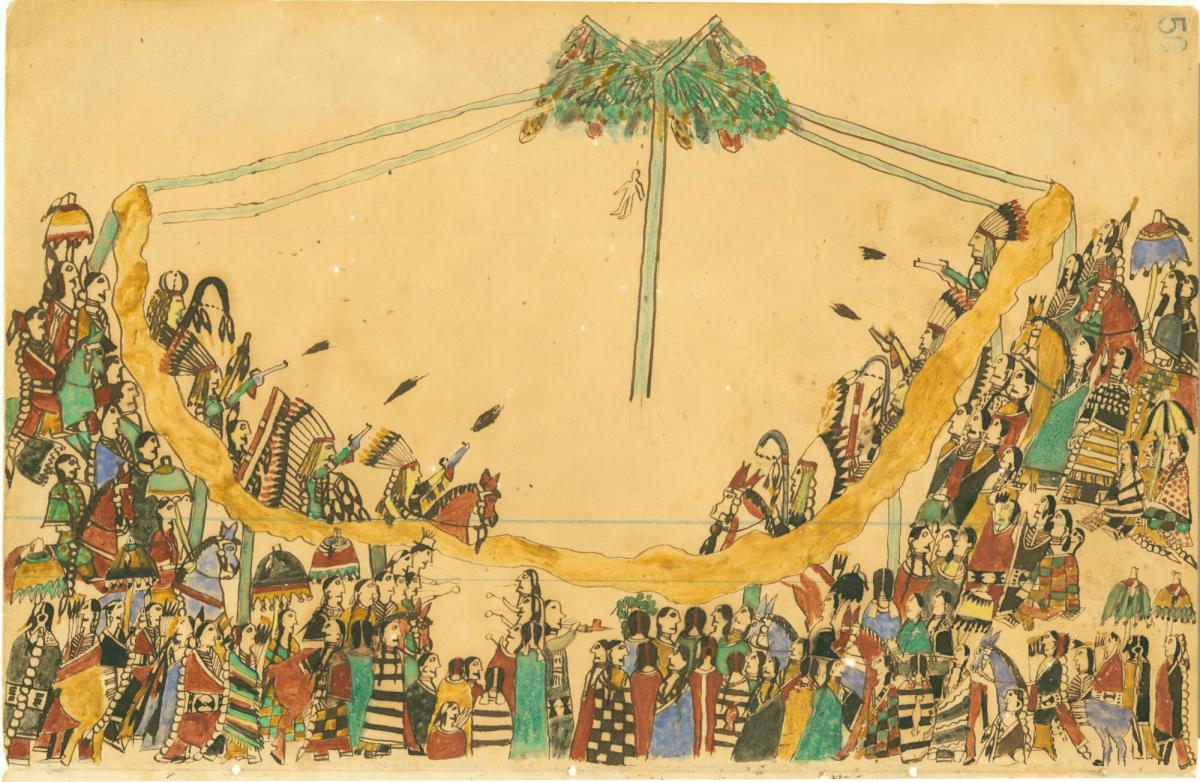 Entry into the Medicine Lodge shows Howling Wolf as a specially honored warrior coming into the sacred lodge on horseback, while other warriors fire at an effigy hanging from the center pole. The Sun Dance ceremony in which they are taking part was an annual life-renewal rite for many Plains tribes; the drawing shows the Sun Dance that took place in summer 1874, Howling Wolf's last before being confined at Fort Marion, Florida, for three years with his father and seventy other captive war leaders.