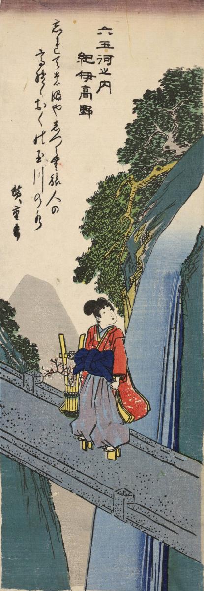 Temple Page on a Bridge by a Waterfall: The Koya Tama River in Kii Province, from the series The Six Tama Rivers