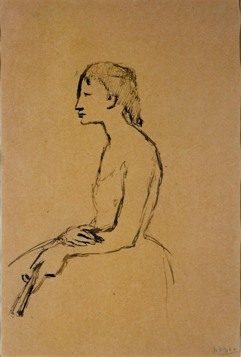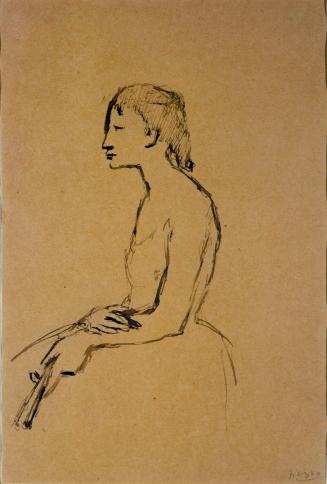 Not on viewMade during Picasso's "rose" period, this is most likely a study for an oil painting of the same title and year. The sketch and painting, however, are remarkably different. Here a dancer sits in profile, her arms resting heavily on her lap, and her left hand lazily holding a fan. Her back curves outward and her eyelids droop. In the painting she is more dramatic and dynamic; she no longer sits and her hand is raised.