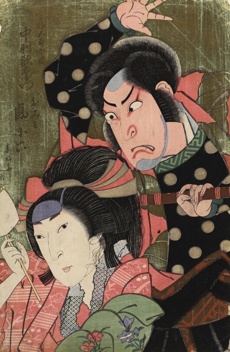 The Actors Nakamura Utaemon III and Arashi Koroku as Fukashichi and Omiwa in the Play "Imoseyama onna teikin," at the Kado Theater