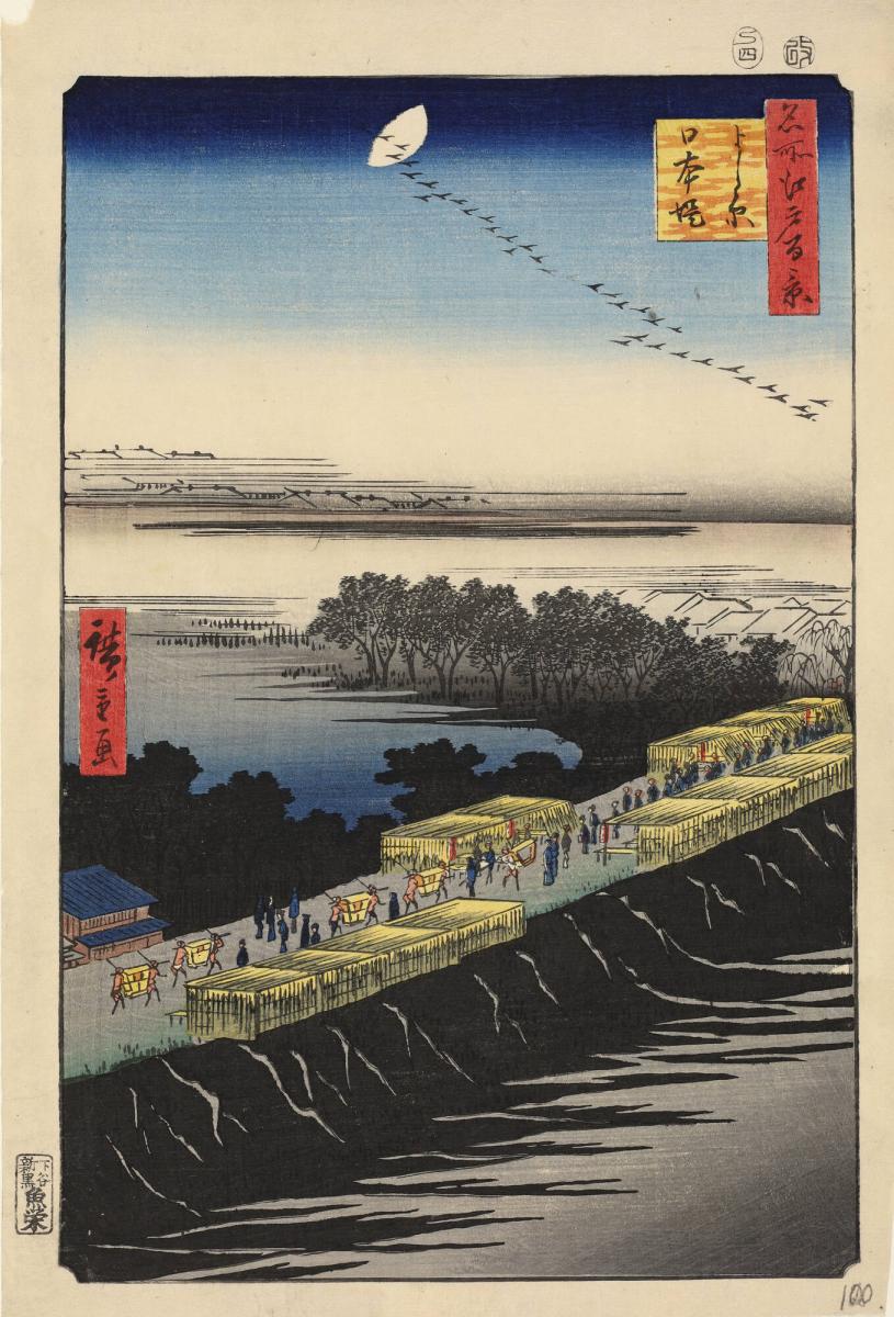 The Nihon Embankment at Yoshiwara (Yoshiwara Nihonzutsumi), from the series One Hundred Famous Views of Edo (Meisho Edo hyakkei)