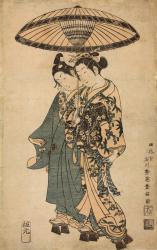 Not on viewA young couple are seen walking under a shared umbrella. The young man (wakashū) on the left has slipped one hand from his kimono to place it near his cheek while his other hand holds the umbrella just below the young woman’s hand. On the left edge of the umbrella is the crest of the kabuki actor Segawa Kikunojō, featuring bundled silk floss (yuiwatamon); on the right is the circular crest with the character 同 of Sanogawa Ichimatsu. This is not an image of an actual scene from a play, but rather a dreamy, imagined pairing of the two stars at the height of their popularity, presented as if they are enacting a journey-scene (michiyuki) from a love-suicide play.