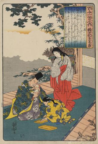Gonchunagon Sadaie Holding a Cat while an Attendant Prepares Fish Shavings, no. 97 from the series The One Hundred Poems