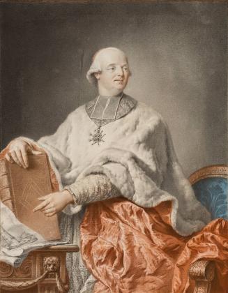 Not on viewThis drawing shows Louis-René-Édouard, cardinal de Rohan (1734-1803), wearing the order of the Saint-Esprit around his neck and pointing to an image of an obelisk that he commissioned. The obelisk honors Henri de la Tour d'Auvergne, vicomte de Turenne (1611-75), who achieved great military fame during the reign of Louis XIV before dying in battle in Sasbach, Germany. Rohan erected the monument in 1782; he was a great admirer of Turenne, and in his capacity as Bishop of Strasbourg also had sovereignity over Sasbach, which is nearby. The monument, a triangular obelisk, was about 15 meters high and made of black marble. It was short-lived, however, being destroyed in 1786 in a fierce storm.