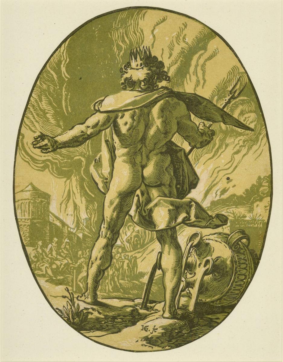 Pluto, ruler of the underworld in ancient Greco-Roman mythology, appears here as a muscle-bound giant overseeing his fiery realm. Figures in the distance are souls being judged and the urn at right stands for the four rivers of Hades. Goltzius’s monumental presentation of the god from behind draws upon his intensive study of ancient sculpture that had been excavated and exhibited recently in Rome, particularly the Farnese Hercules, which likely was a model for Pluto’s powerful physique. Goltzius created this chiaroscuro print in several different color combinations, using a separate woodblock for each color. The green and yellowish tones in this example add sharpness to the design and heighten the visual effect of the formidable subject.