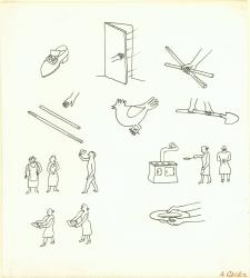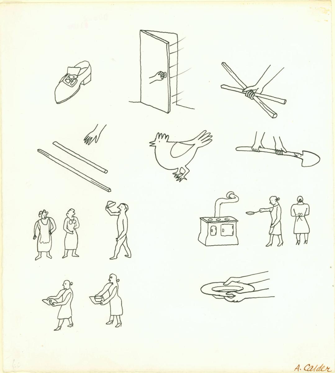 Not on viewAlexander Calder made a series of 85 drawings to illustrate Three Young Rats and Other Rhymes, a whimsical book of anonymous nursery-rhymes edited by James Johnson Sweeney and published by the dealer Curt Valentin in 1944. The artist’s playful and sometimes humorous interpretations of the rhymes are rendered in a simplified and continuous linear style. These compositions recall Calder’s imaginative wire sculptures, impressively formed out of single pieces of thin wire to resemble line drawings in three-dimensional space.
