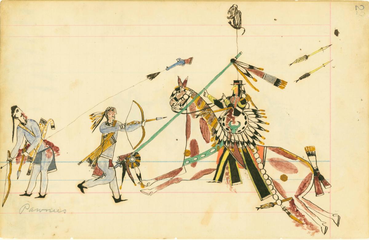 Howling Wolf's ledger drawings were given to Oberlin College in 1904 by Helen Finney Cox (OC 1846), daughter of Oberlin College's second president, Charles Grandison Finney. The drawings had come to her through her son-in-law, whose father, John Pope, was commander of the Department of the Missouri from 1866 through 1883. General Pope, whose headquarters was at Fort Leavenworth, may have acquired the ledger drawings when Howling Wolf and the other prisoners from the Southern Plains wars passed through during their enforced journey to Fort Marion in 1875.