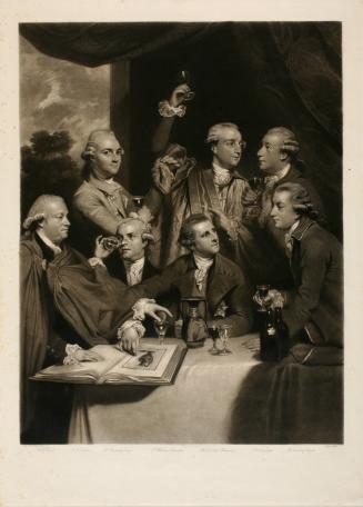 Not on viewWilliam Hamilton, seated in the center, into the Society of Dilettanti, an elite gentlemen's club dedicated to connoisseurship and study of the antique. Hamilton points to a Greek vase from his renowned collection, the ostensible focus of the scholarly gathering. Membership required having been on the Grand Tour, a fashionable ritual whereby aristocratic young gentlemen traveled the Continent to cultivate taste and erudition. In reality, the club included many notorious rakes, and Horace Walpole scoffed that "the nominal qualification is having been in Italy, and the real one, being drunk." Here, the abundance of wine and a woman's garter - held up by the man standing on the left - intimate the group's other, bawdier preoccupations: drinking, whoring, and gambling.