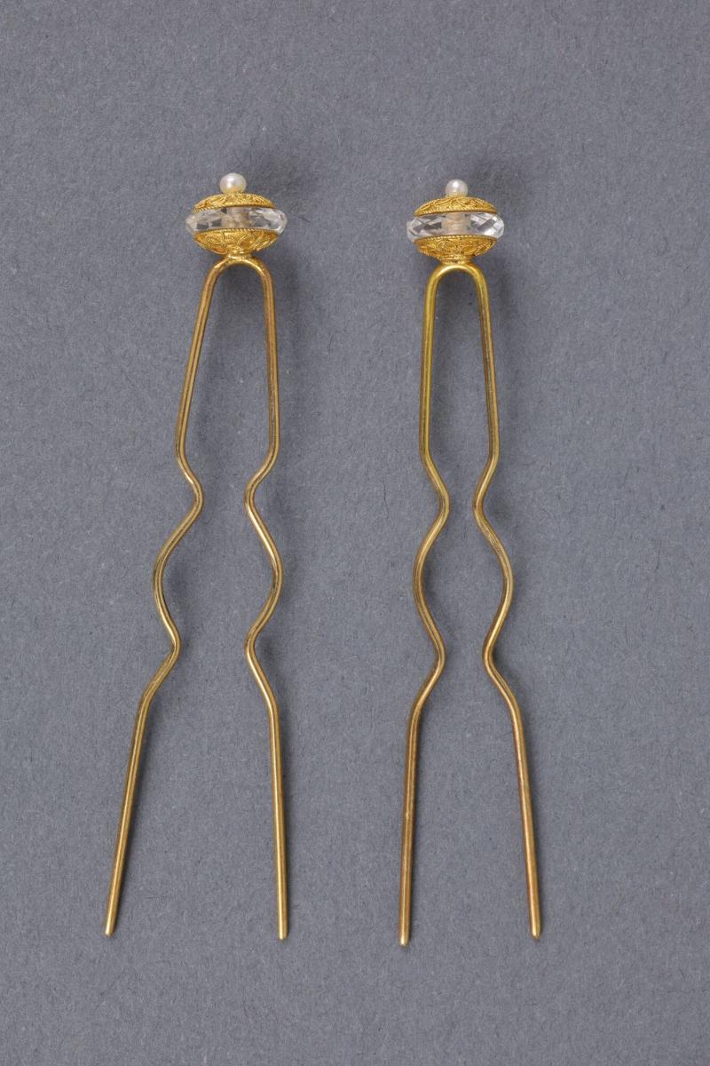 Two Hairpins with Crystal, Gold and Pearl Apex
