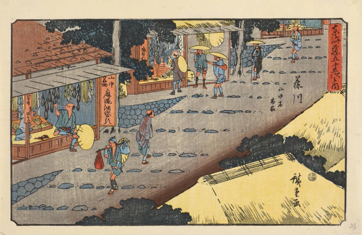Shops Selling Hemp Ropes at Yamanaka Station near Fujikawa, no. 38 from the series The Fifty-three Stations of the Tōkaidō