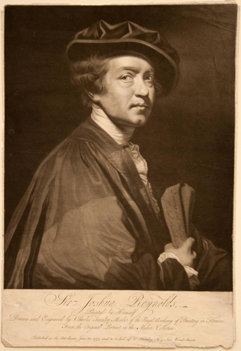 As the first President of the Royal Academy, Joshua Reynolds sought to build respectability for his profession, cultivating an identity as a learned and gentlemanly painter. In his 1775 self-portrait presented to the Uffizi Gallery in Florence, Reynolds appears not at his easel with palette and brush but in the guise of a man of letters. Wearing the academic robes of his honorary doctorate from Oxford University, Reynolds holds drawings by "the divine Michelangelo," which proclaim his self-declared lineage with the Old Master.