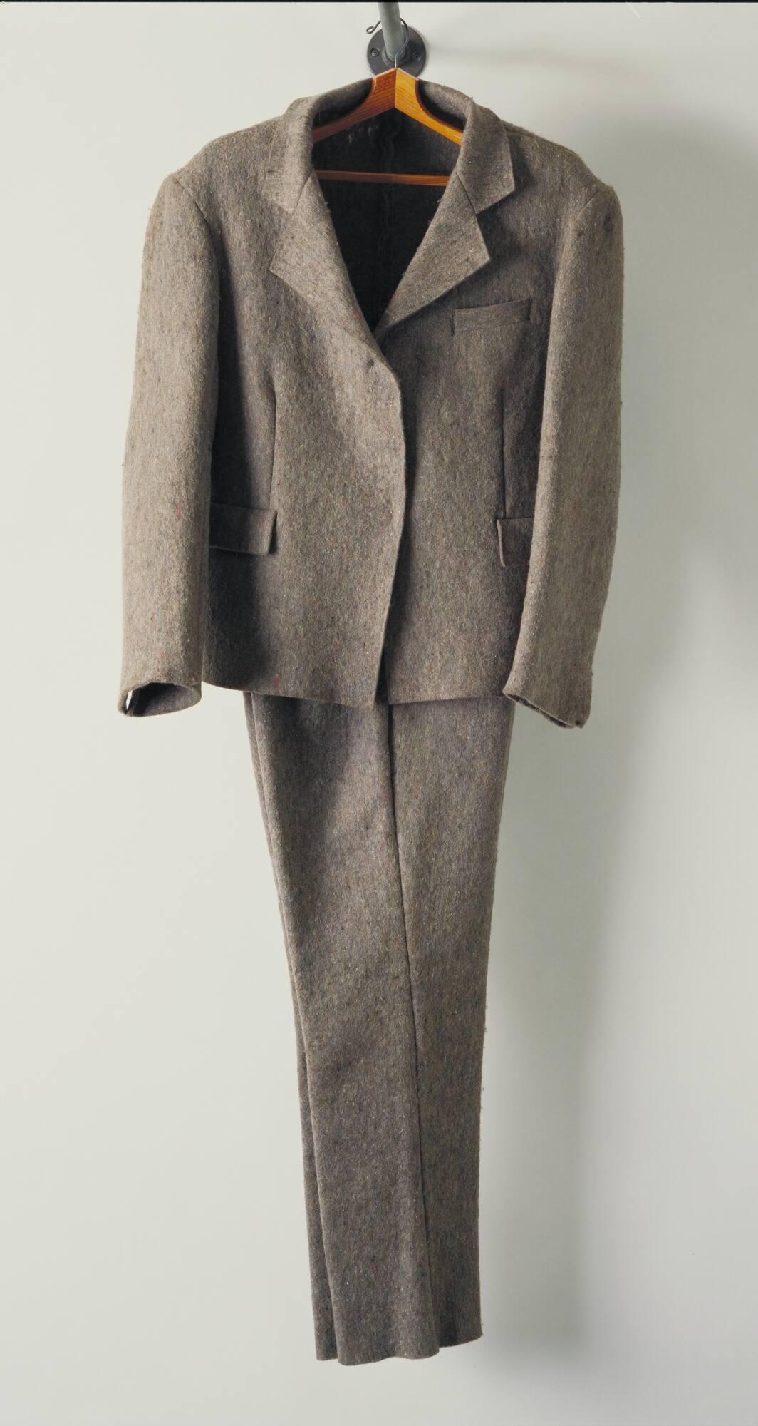In the so-called “crash story” and in many of Beuys’s sculptures, felt serves insulating, protecting, and healing functions, making it the ideal material for a suit that could envelop the whole body. Modeled after one of Beuys’s own suits (with the sleeves and legs elongated), Felt Suit was produced in an edition of 100 and sold for a relatively modest sum. Beuys donned a version of the suit in a Fluxus performance with Terry Fox and again in a demonstration in Switzerland, but expressed utter indifference as to how it was displayed by his collectors, telling one of his publishers, “I don’t give a damn. You can nail the suit to the wall. You can also hang it on a hanger, ad libitum! But you can also wear it or throw it into a chest.”