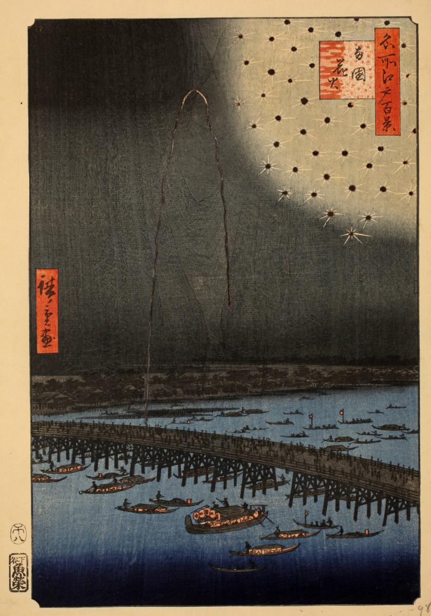 Fireworks by the Ryōgoku Bridge (Ryōgoku hanabi), from the series One Hundred Famous Views of Edo (Meisho Edo hyakkei)