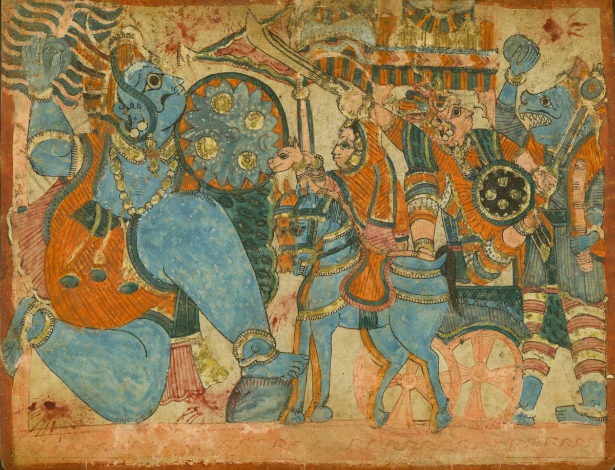 Bold and colorful images like this, known as chitrakathā, or picture stories, were made in southern India in the 19th century and used as illustrations in public storytelling performances by a caste of wandering storytellers called Chitrakathis. Made in large sets of images, they typically represented scenes from the Hindu epics the Rāmāyaṇa and the Mahābhārata, or tales of the legendary king Harishchandra. Because the illustrations were often based on local versions of the epics, specific identification of subjects is difficult today.
