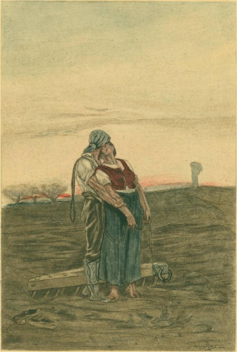 Not on viewTwo farmers embrace in the midst of a barren field. More than a gesture of intimacy, their kiss is presented as a passionate, all-consuming expression of love. The couple’s unabashed performance of romance, here rendered inseparable from the act of labor, reinforces the idealized notion of agrarianism present throughout the 19th century.