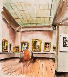 Not on viewThis drawing is part of a group of five watercolors of interior spaces at the Allen Memorial Art Museum made by Paul Arnold, Oberlin Professor Emeritus of printmaking and current Oberlin resident. They show the Stern gallery, with its characteristic angled corners; one depicts the luminous laylights that formerly allowed in natural light. The Museum is currently seeking to raise funds to restore and re-open these laylights as part of its on-going building renovation. Arnold has here lovingly captured a moment in the museum's formative years, in which the installation is similar to that of today but at a time when galleries were bathed in the day's changing light, enhancing the visitor's experience of the works on view.
