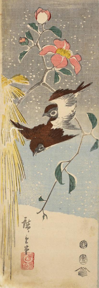 Sparrows and Winter-blooming Camellias in Snow
