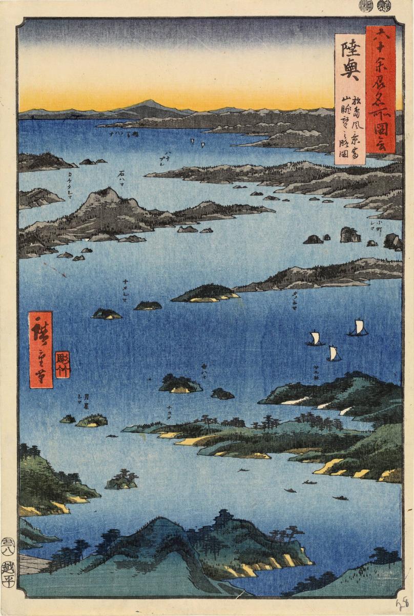 View of Matsushima with a Distant Prospect of Mt. Tomi in Michinoku Province, no. 28 from the series Pictures of Famous Places in the Sixty-odd Provinces