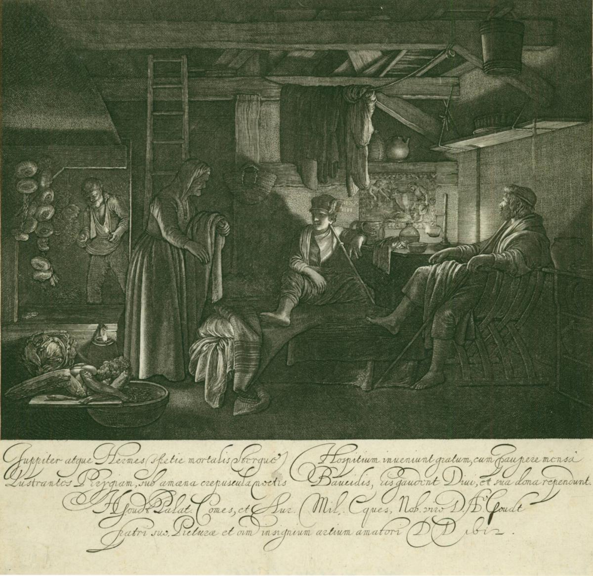 Not on viewThis print illustrates the Greco-Roman myth of the gods Jupiter and Mercury disguising themselves as ordinary peasants in need of hospitality. All, except the poor couple Baucis and Philemon, whose generosity surpassed that of their rich neighbors, rejected them. This engraving shows the moment when Baucis realizes that their guests are gods, a revelation that is conveyed in the artful placement of the room’s single source of light next to the supernatural beings.