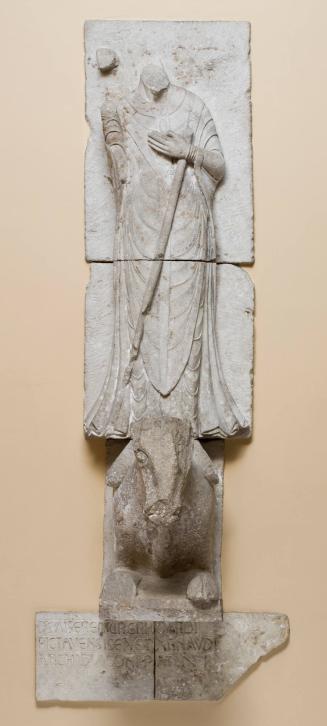 ProvenanceCommandant Noirot, Paris; (Unrecorded dealer, Paris, until 1932); (Galerie E. Brummer, Paris and New York); purchased 1948 by Allen Memorial Art Museum, Oberlin, OHGuillaume Adelelme was bishop from 1124 until his death in 1140, and Grimoard from 1141 until his own death in 1142. Adelelme's statue was to the right, and Grimoard's to the left, as one faced the entrance door of the church. The inscriptions identifying the bishops (which have been installed under the figures in the AMAM) were originally between the sculptures and the door, at their shoulder level. These inscriptions also mentioned the church's Archdeacon Arnaud, documented in the service of the diocese from 1140 to 1155, providing the probable year by which they were made. Above the main door was a third inscription, likening the entrance to that of the Temple of Solomon, which was said to be described as "between a bull and lion." These two animals, known for their strength, were important symbols in many ancient religions, and along with the eagle and man became symbols of the evangelists.