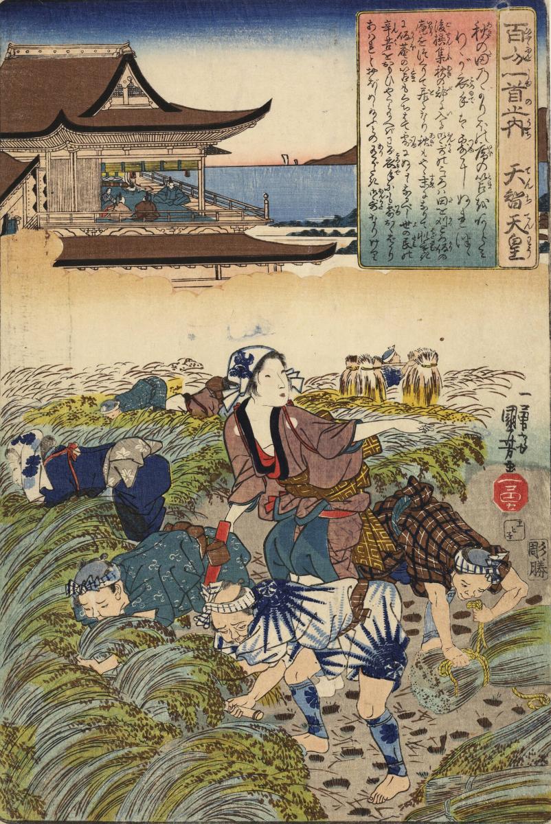 The Emperor Tenchi Watching Peasants Harvesting Rice, no. 1 from the series The One Hundred Poems