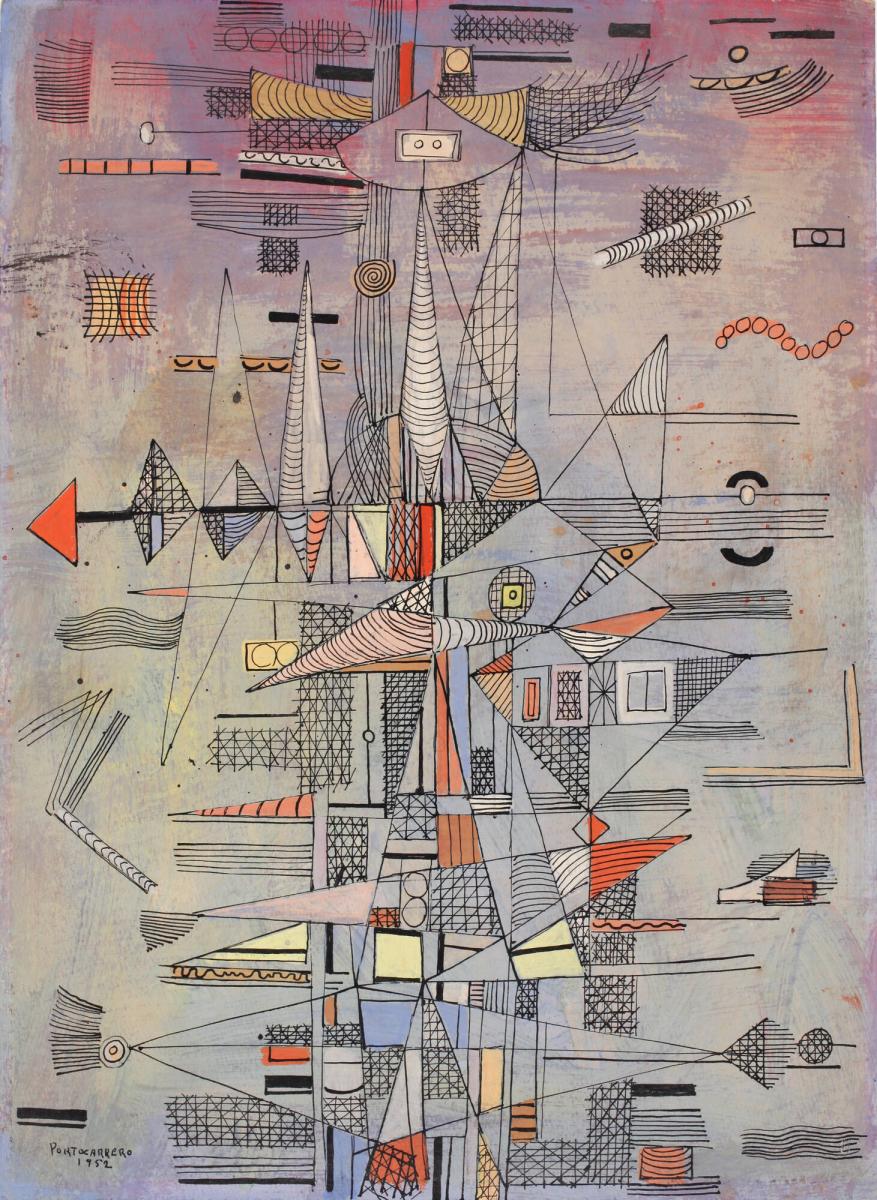 The composition is a complex configuration of spirals, triangles, circles, dots, hatchmarks, and parallel lines. Despite the emphasis on geometry, the arrangement reads as an upright totemic figure: a triangular head punctuated by two eyes is discernible at top center. Portocarrero often constructed human forms from geometric shapes, particularly triangles. The figure in this work may relate to Portocarrero’s representations of Caribbean popular and religious practices, such as Carnival or Afro-Cuban traditions. The latter was also an interest of fellow Cuban artist Wifredo Lam.