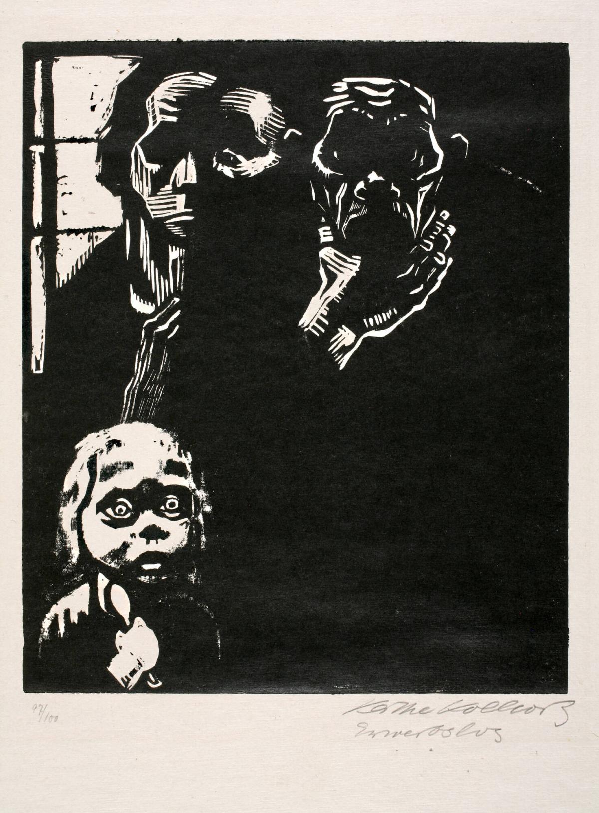 Not on viewKollwitz's commitment to using her art as social commentary increased as she turned to lithography and woodcuts, which replaced etching as her preferred media. After the turbulence of the war and the failed Weimar Republic, Kollwitz solidified her choice to make art that would serve the people. Unemployment captures the misery and desperation prevalent in the Weimar economy with innovative skill, representing her traumatized subjects as the white negative space in a pervading darkness and sense of gloom.