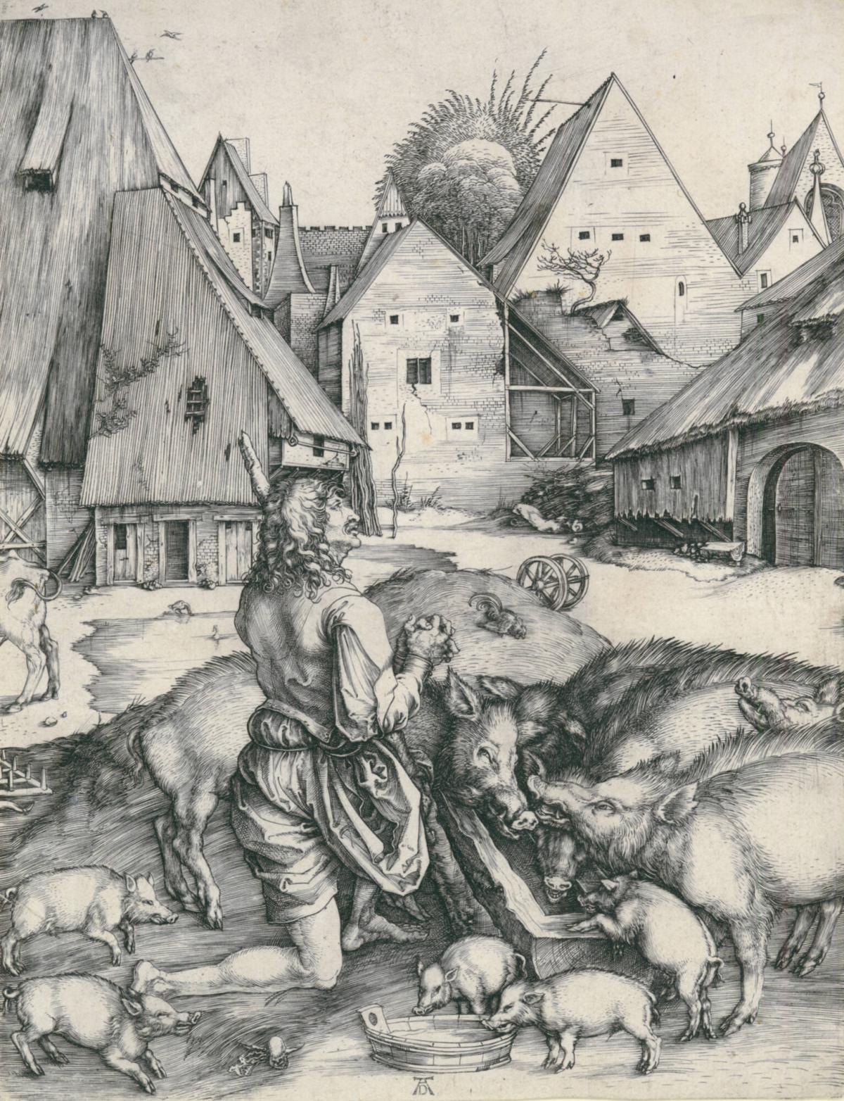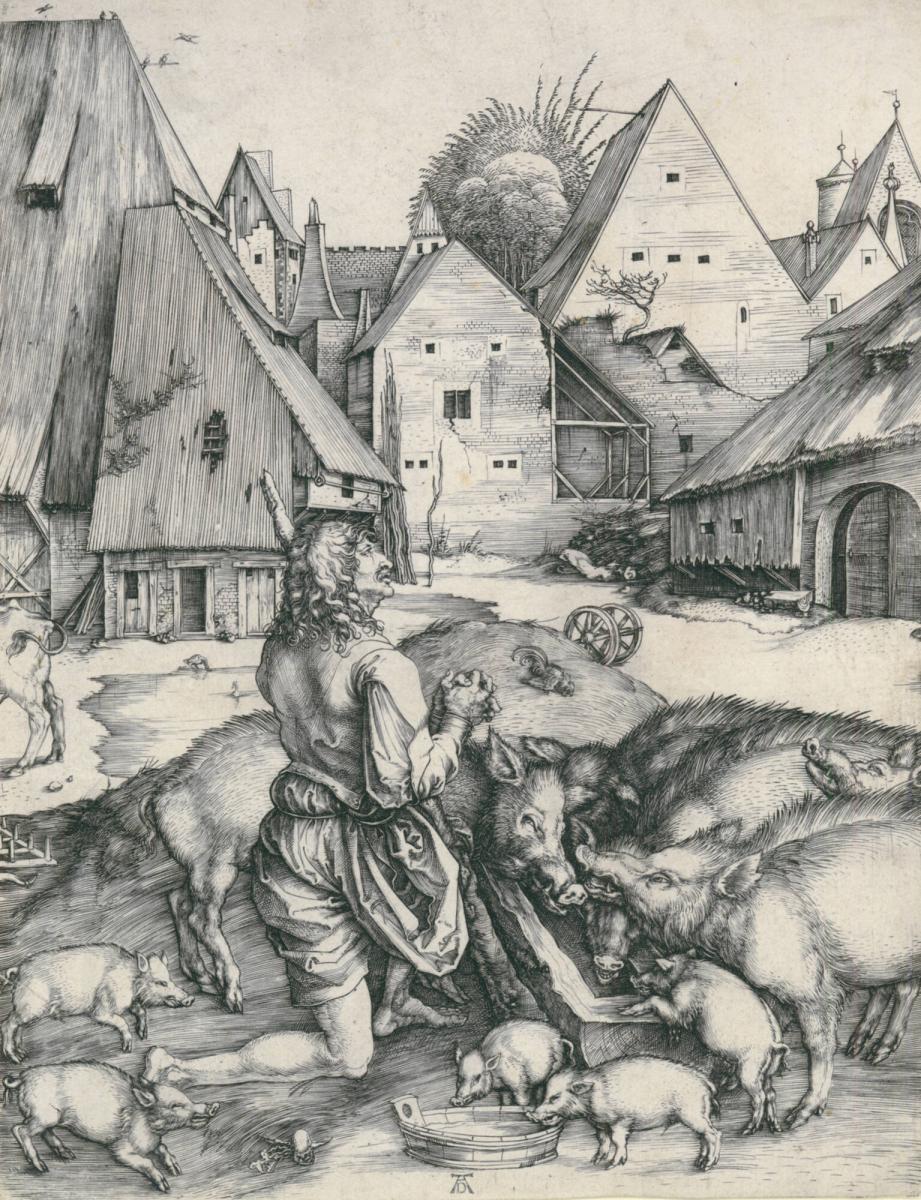 This beautiful impression of The Prodigal Son shows in brilliant detail Dürer's poignantly human interpretation of the biblical parable as a contemporary genre scene-an effect heightened by the artist's naturalistic rendering of the thatched architecture of a German farmyard. The ragged and barefoot peasant, swineherd, and landscape underscore Dürer's keen observation and specificity of description. Here, Dürer combines the critical moment of penitence and return, an iconography adopted by later artists, including Rembrandt.