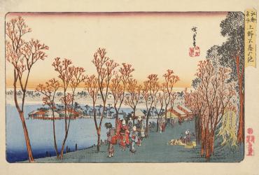 Trees Coming into Leaf at Shinobazu Pond in Ueno, from the first series Famous Places in Edo