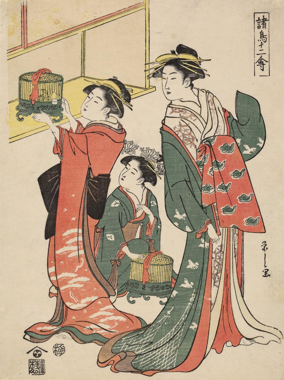 Courtesan and Attendants with Two Caged Quail, from the series Twelve Birds