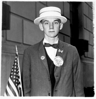 Not on viewArbus was intrigued by the bizarre aspects of human existence, and she documented the underside of mainstream culture in many of her photos. Whether she was wandering the streets of New York, or seeking out subjects at various pageants, conventions, competitions and other events across the country, Arbus was constantly in search of distinct and unusual subjects. The artist was exceptionally sensitive to nuances of expression or gesture. In this image she has captured the open expression and vulnerability of her young sitter, despite the evocative message of his pro-war accessories.