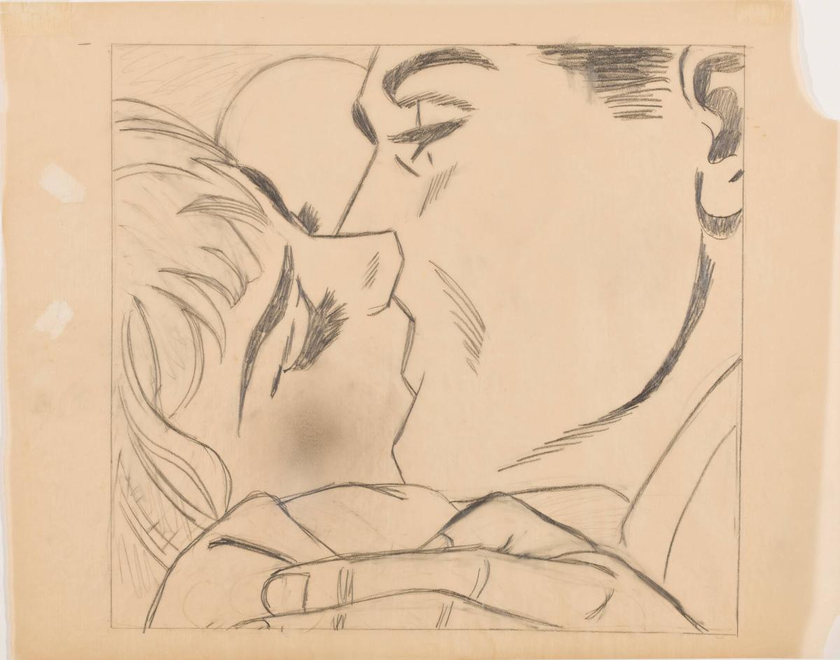 Not on viewLichtenstein, one of the most emblematic artists of the Pop Art movement, began to appropriate the subject matter and style of popular comic books in the 1960s. His works, though painted on canvas, imitated commercial printing techniques. He represented tonal variations with patterns of colored circles that mimicked screens of half-tone Benday dots used in newspaper printing. This drawing is a study for a larger painting. Characteristic of his choice of subject matter, it depicts a romantic scene; a man and a woman share a kiss beneath a full moon. Copied from a comic printed in a newspaper, Lichtenstein made a preliminary drawing in which he slightly altered aspects of the composition, such as tightening the frame and giving the woman bangs. He then used an opaque projector to transfer the drawing to a primed canvas. Lichtenstein emphasized the artificiality of comic books by enlarging and stylizing his source material.