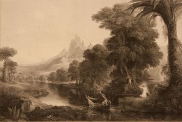 Not on viewCole's Voyage of Life (1839-40) depicts life's phases in a cycle of four paintings: Childhood, Youth, Manhood, and Old Age. The series sketches an allegorical pilgrimage through the landscape as symbolic of an individual's progress to Christian salvation. The apparition of a fabulous cloud castle in Youth epitomizes the hopes, aspirations, and possibilities characteristic of the age. Smillie's engraved reproductions of the Voyage of Life were popular in homes throughout North America, and helped spread a romantic, allegorical reading of the native landscape.