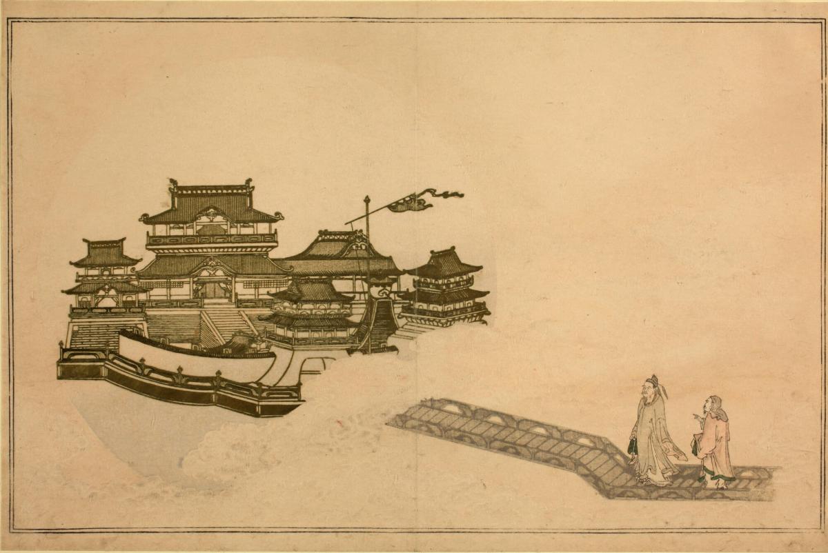 Not on viewThe Moon-Mad Monk, or Crazy Gazing at the Moon (Kyōgetsubō 狂月坊), was a series of kyōka poems illustrated by Utamaro with a set of surimono prints. Here, the otherworldly beauty of the palace of the moon goddess is captured with embossed clouds, gold pigment (probably copper-rich brass) for the palace, and silvery metallic pigment (probably copper-rich zinc) for the bridge.
