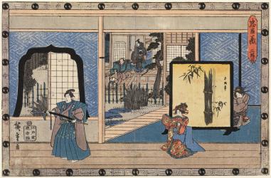 Tonase Watches Rikiya and Konami as Honzo and Wakasanosuke Meet in the Background, Act 2 from the series Chushingura